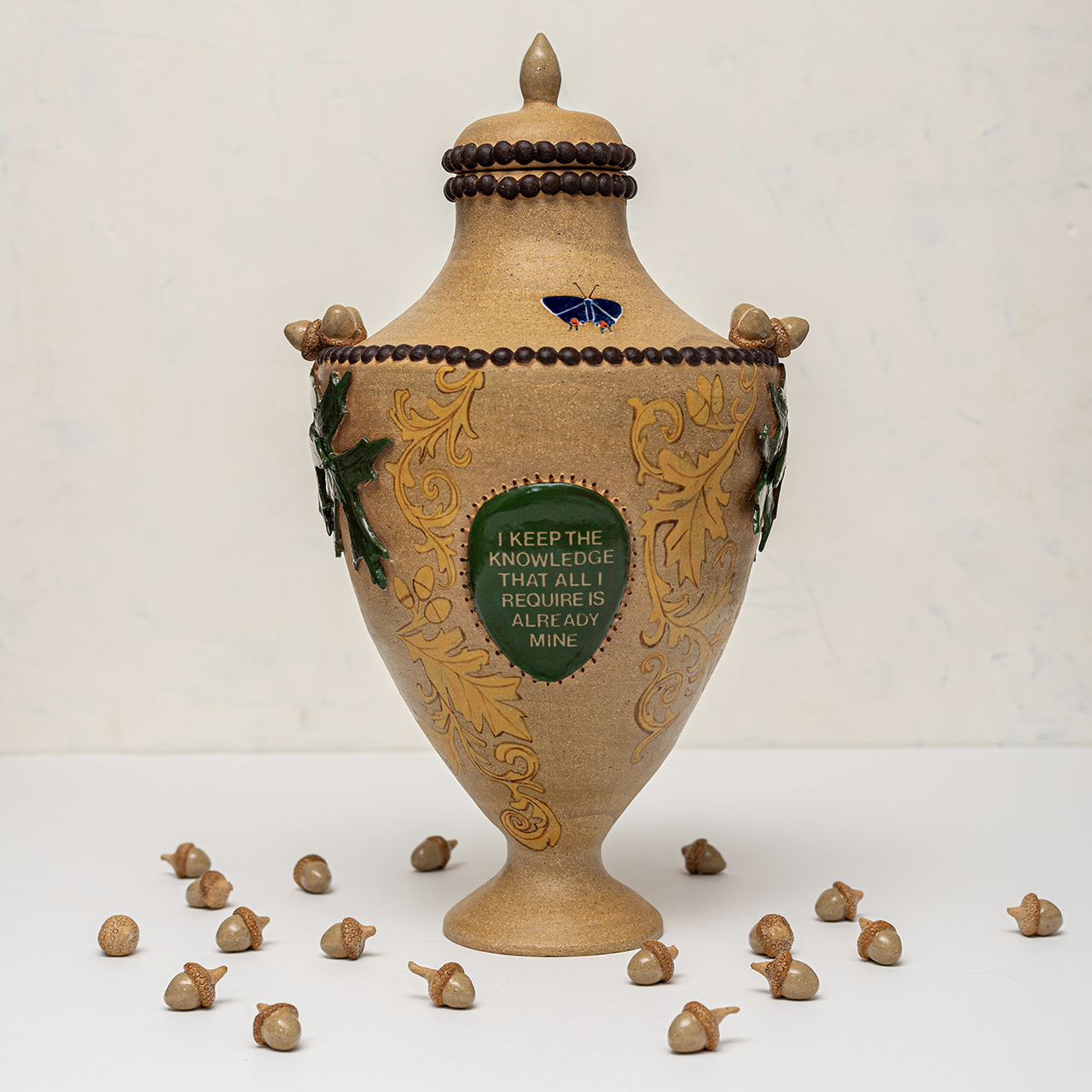 In Ritual Matter, I work with classical ceramic forms such as urns, vessels, and offering plates. The series emerged from a psychedelic experience and centers on beauty and the garden as metaphor. The work includes gilded garden urns blooming with fungi, offering plates bearing spore prints, and vessels that articulate a held sense of sufficiency and connection.