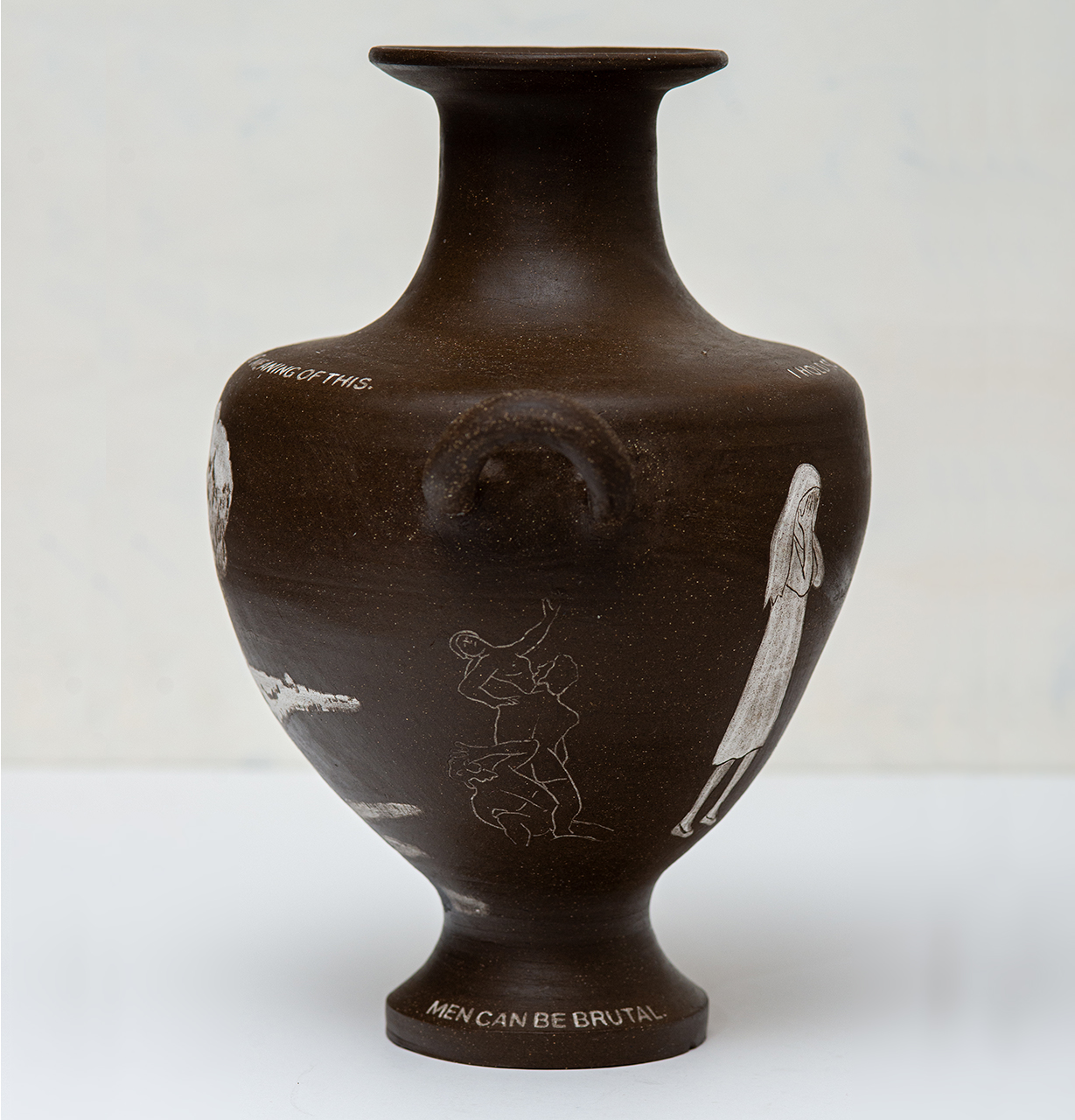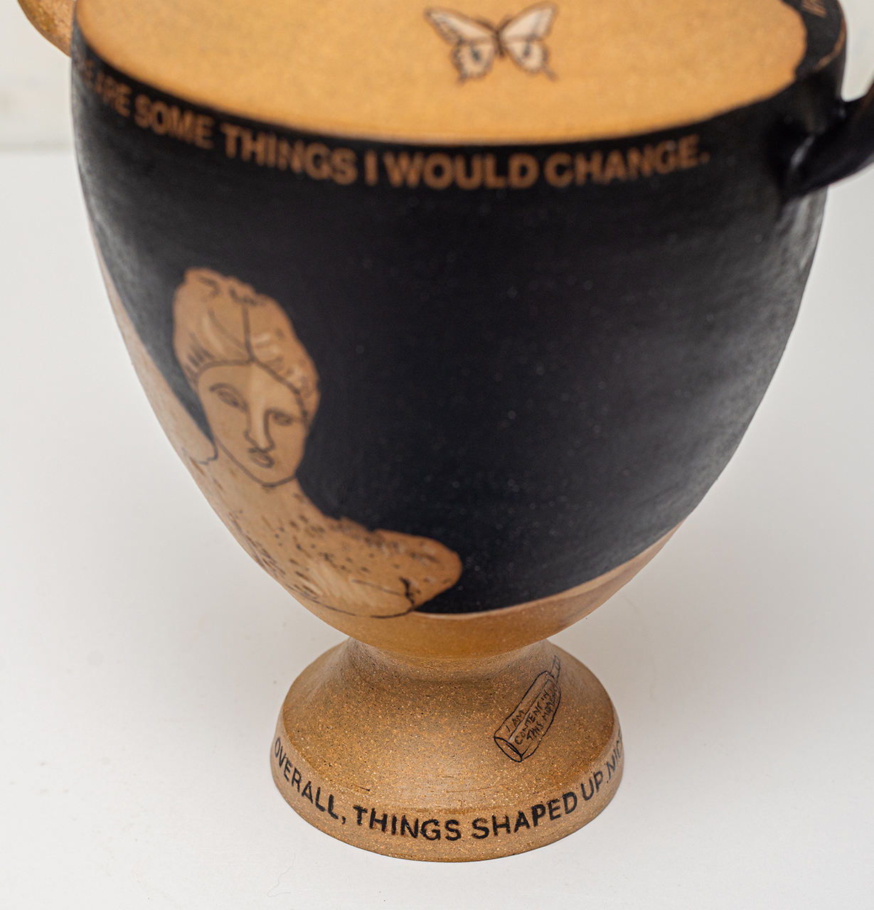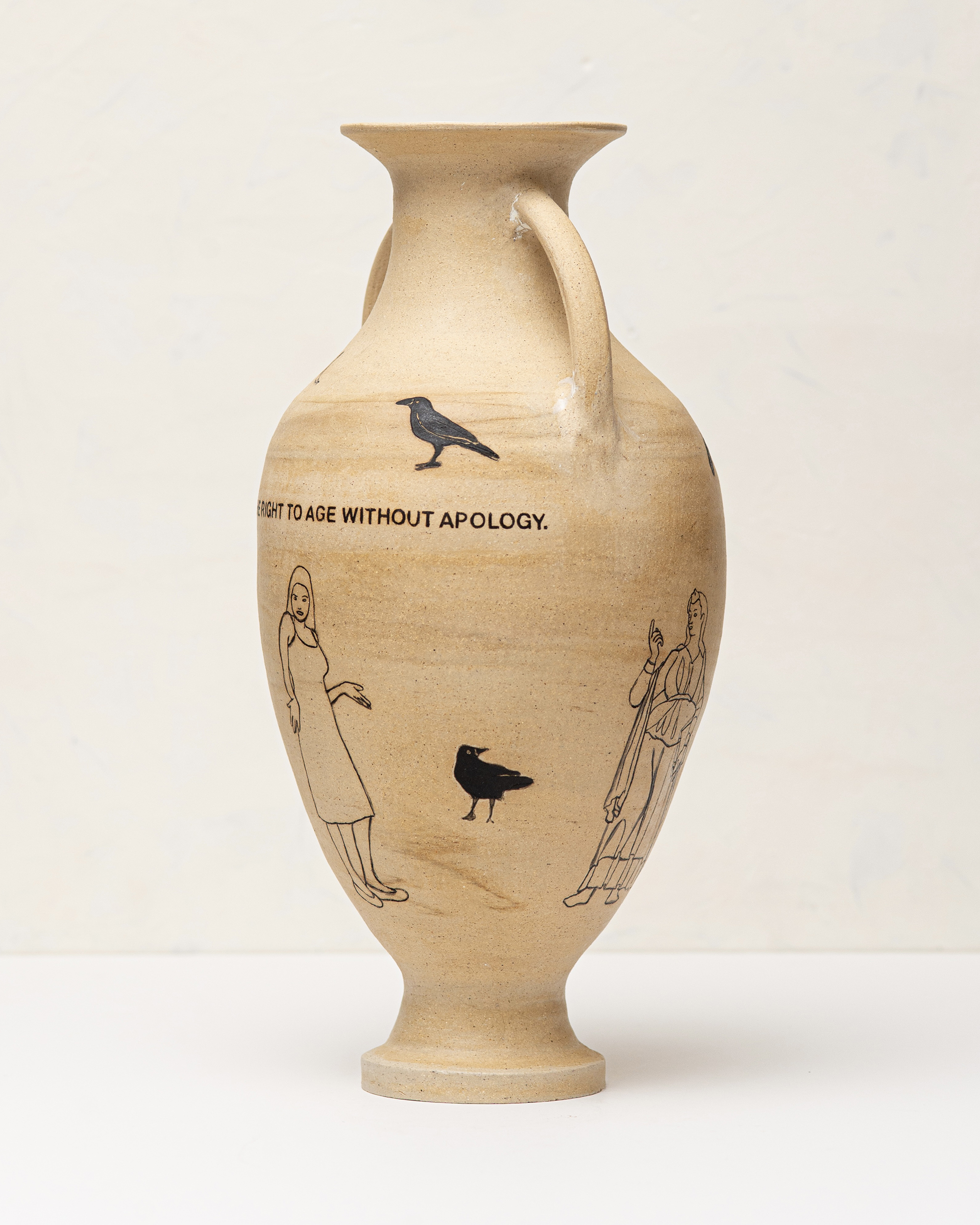 In Bearing Witness, I work with classical ceramic forms and art historical imagery to address the present. The vessels carry modern language and self representation across surfaces associated with permanence and authority, reframing inherited symbols of power. Text and drawing establish a narrative relationship between the self and the vessel, making history personal rather than distant.