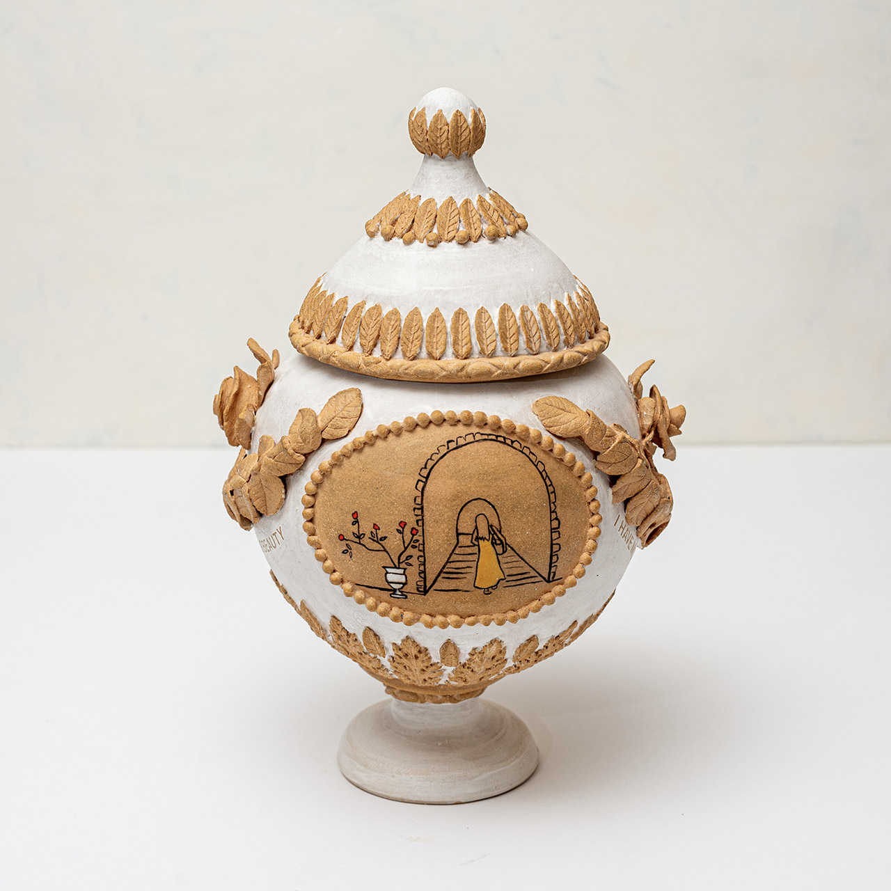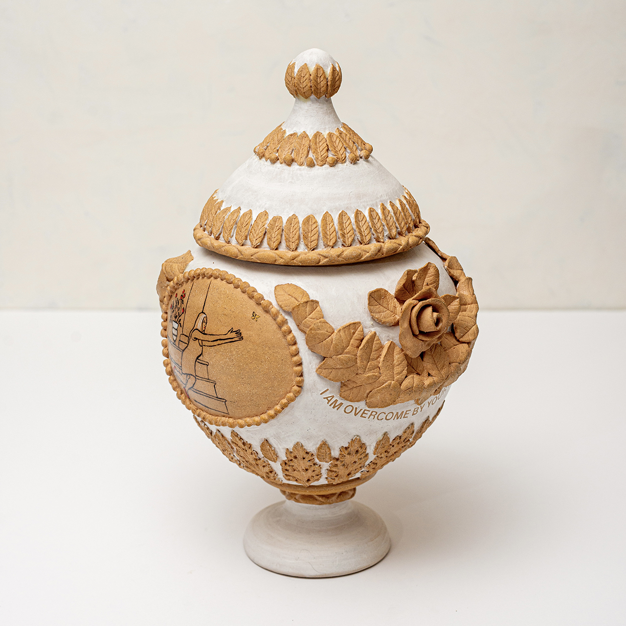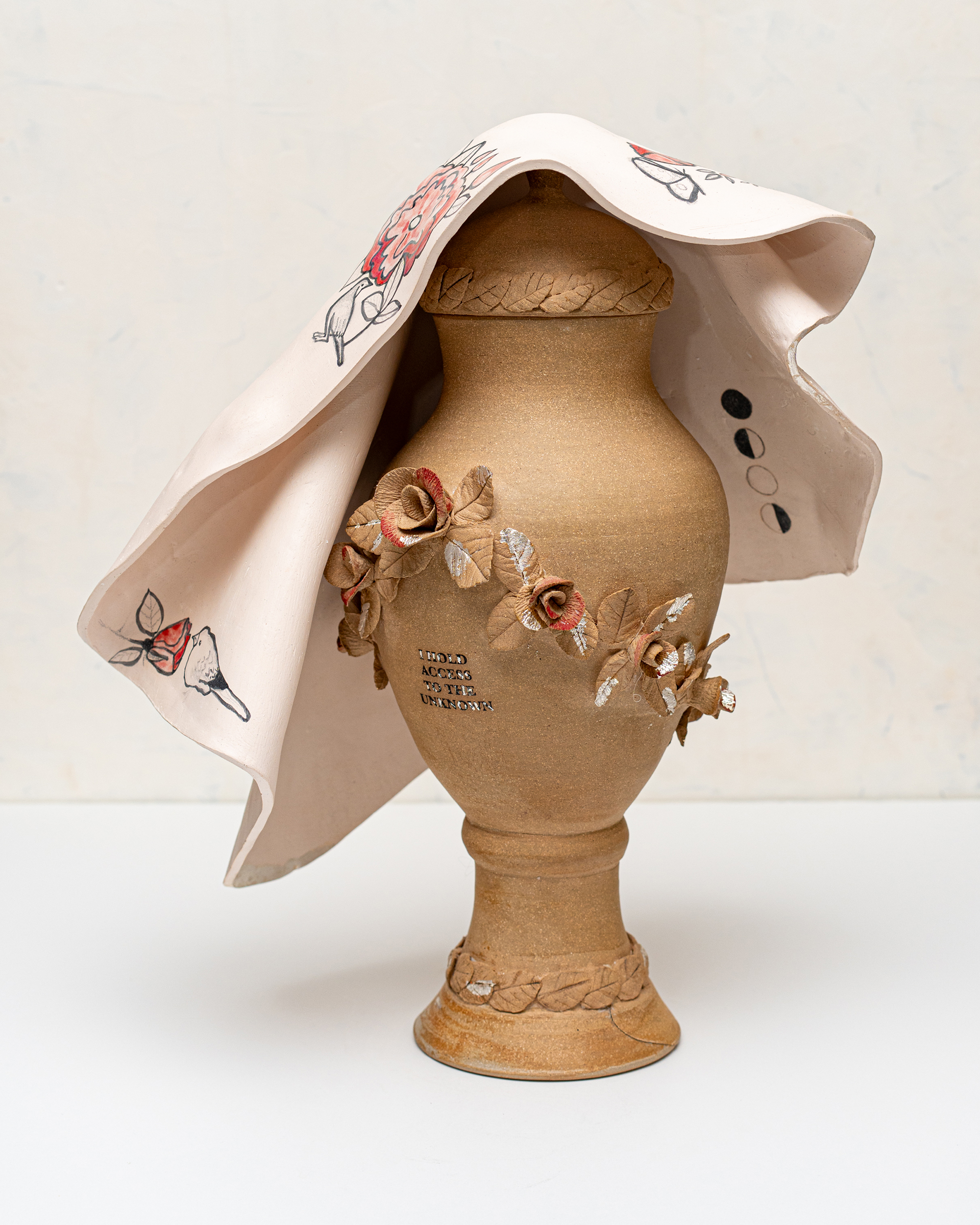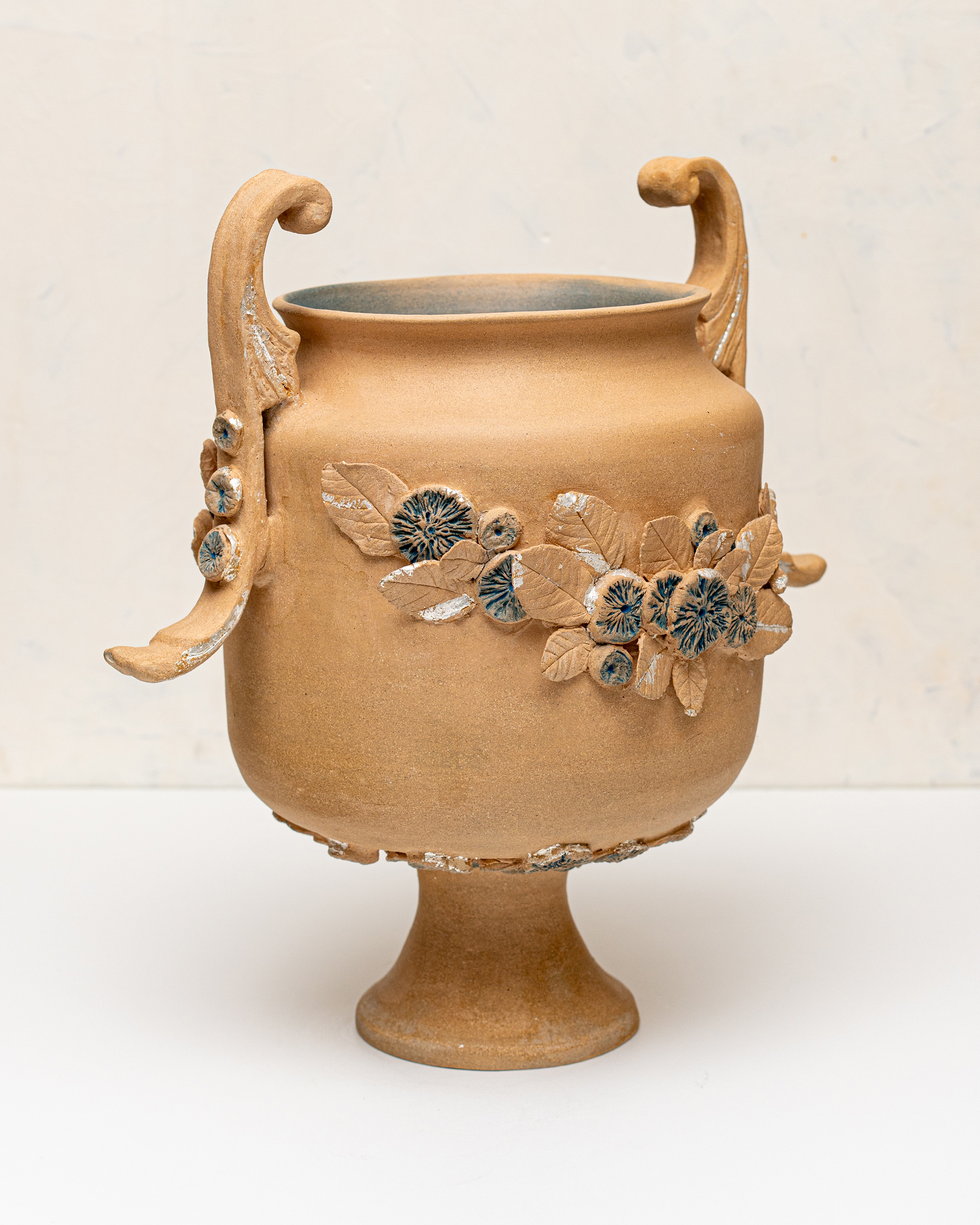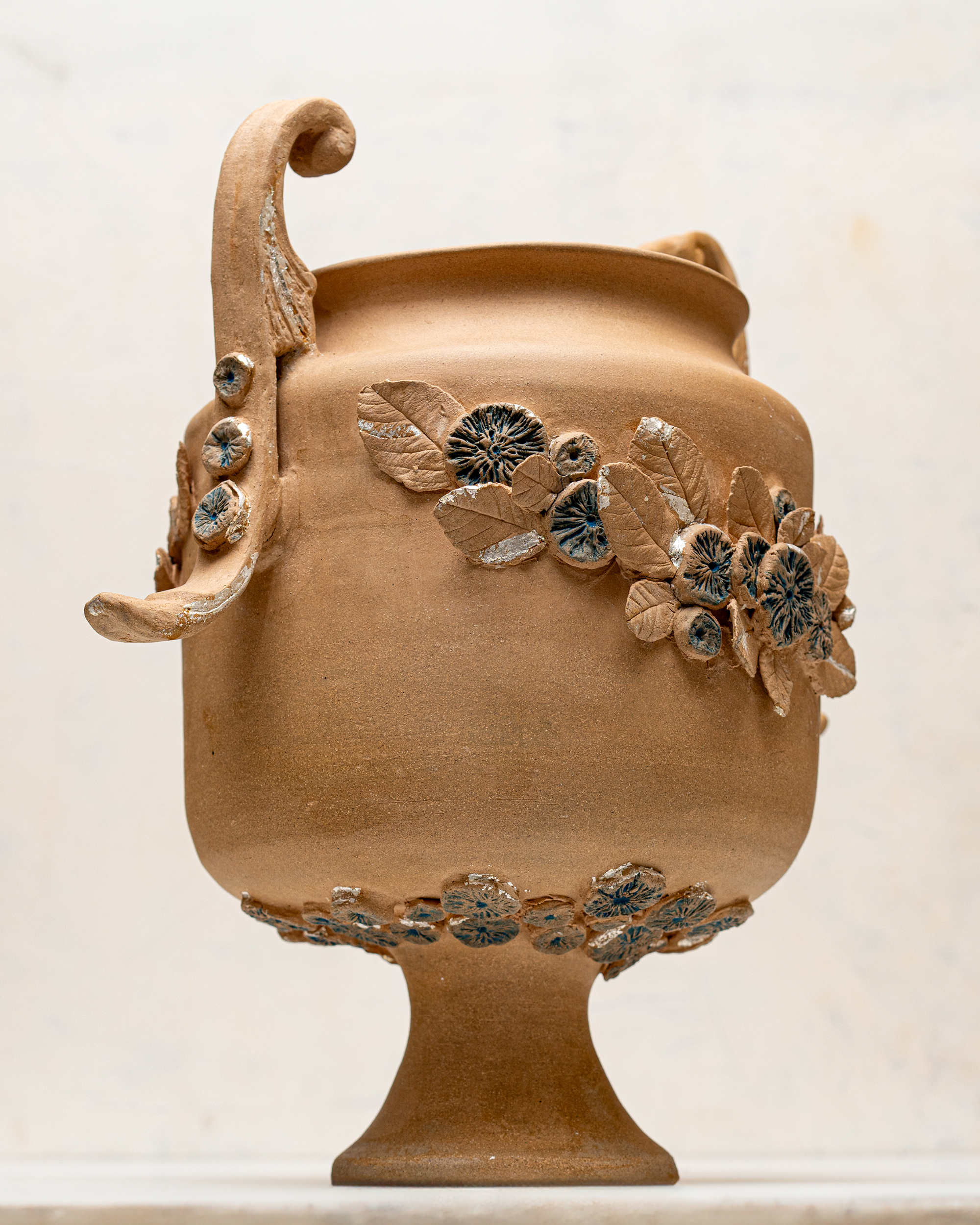 In Ritual Matter, I work with classical ceramic forms such as urns, vessels, and offering plates. The series emerged from a psychedelic experience and centers on beauty and the garden as metaphor. The work includes gilded garden urns blooming with fungi, offering plates bearing spore prints, and vessels that articulate a held sense of sufficiency and connection.